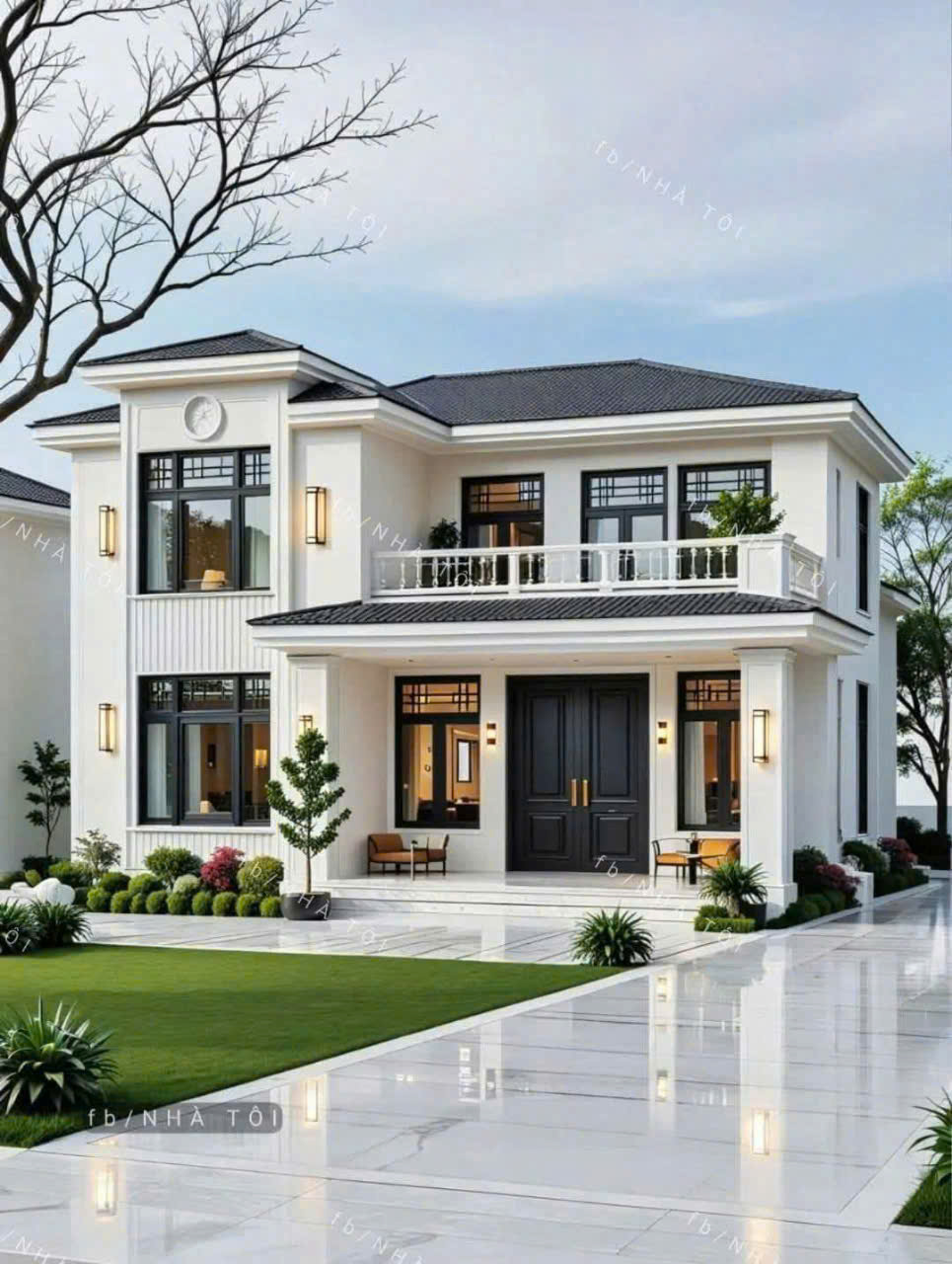 • Mặt tiền: Ốp đá tự nhiên hoặc gạch thẻ ở tầng 1, sơn nước cao cấp ở tầng 2, cửa kính lớn và ban công tạo điểm nhấn.