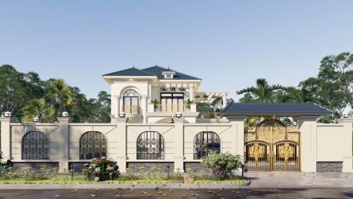 - Mặt tiền phụ: Tường sơn trắng kết hợp ốp đá granite ở tầng 1, các cửa sổ lớn phân bố đều, mái Thái kéo dài che phủ một phần.