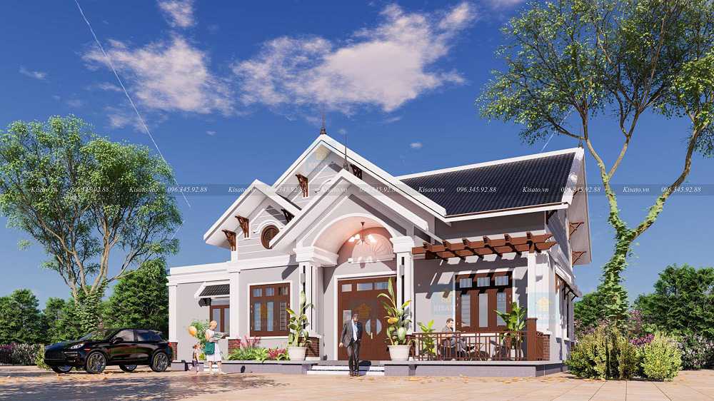 - Màu sắc: Tông màu trung tính như trắng, xám, kết hợp với mái ngói xanh dương hoặc đỏ đậm.